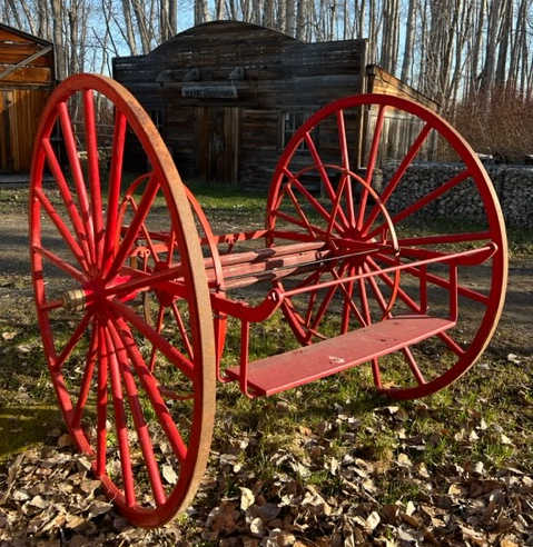 Vintage fire hose cart. Hand drawn portable service vehicle. Pressurized water supplies became more common place in the late 1880's and fire hoses soared in popularity for fire fighting. The two wheeled fire hose carts, known as "jumpers" could role over curbs, steps and rough terrain easier than four wheeled wagons. The hose is wound onto a freely rotating drum. Auction price is payable in Canadian $.